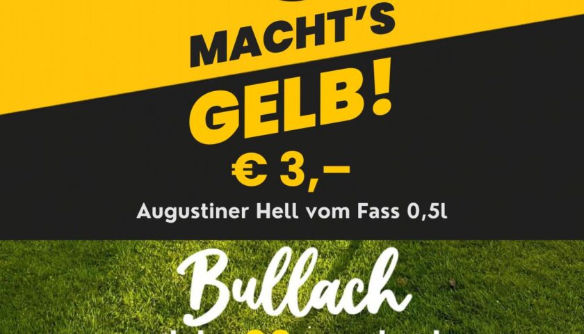 Wer TSV-Kleidung oder irgendwas Gelbes trägt, bekommt von uns das Augustiner Hell 0,5l vom Fass für nur 3,- € — als kleines Zeichen, dass wir hinter unserer Mannschaft stehen.